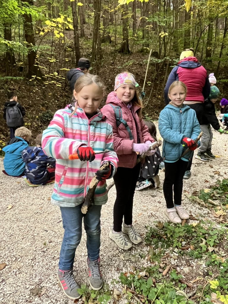 Vor den Herbstferien erlebten die Kinder der 3.a einen aufregenden Vormittag im Wald. In Begleitung einer Waldpädagogin erkundete die Klasse Bäume, Pilze und Sträucher im Wald. Das Schnitzen und Sägen von Stöcken machte den Kindern besonders viel Spaß.