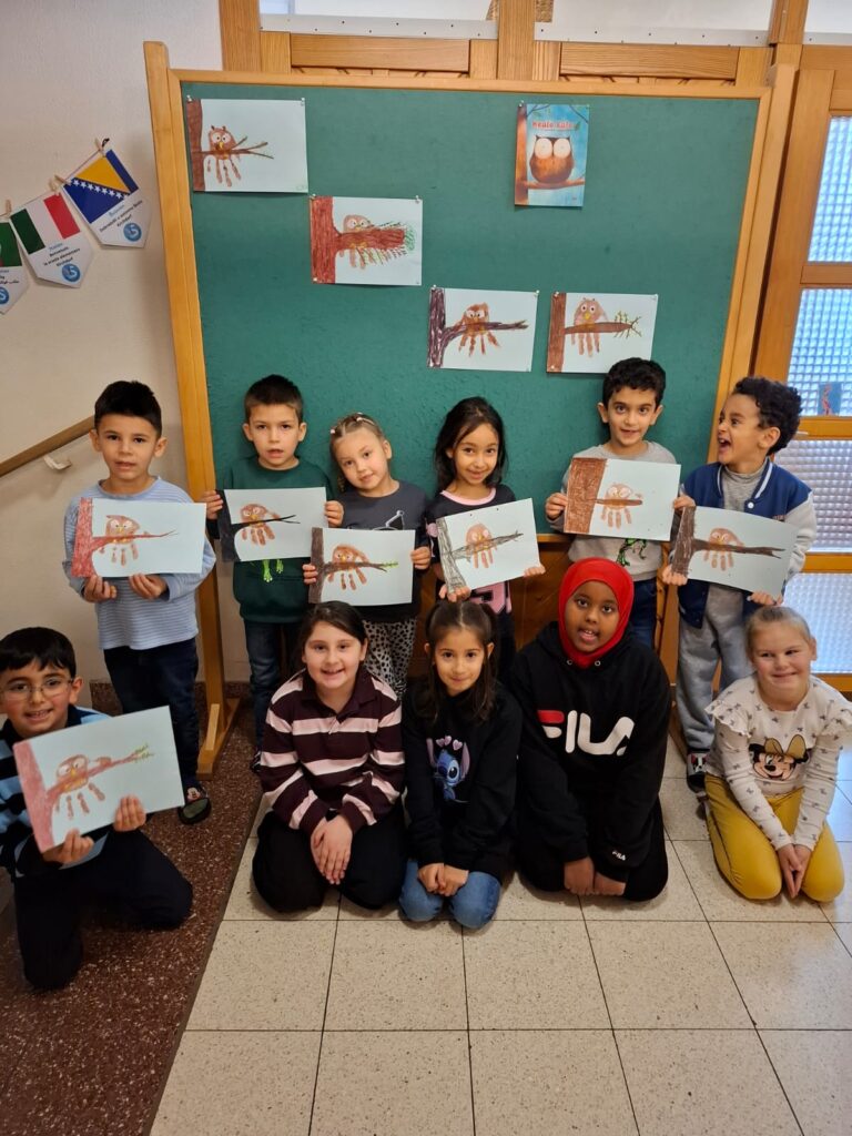 Die Kinder aus der Deutschförderklasse haben sich intensiv mit dem Buch „Heule Eule“ beschäftigt. Im Kreis haben es sich alle gemütlich gemacht und das Buch wurde gemeinsam gelesen und angeschaut. Im Anschluss haben alle Kunstwerke passend zum Buch gestaltet.