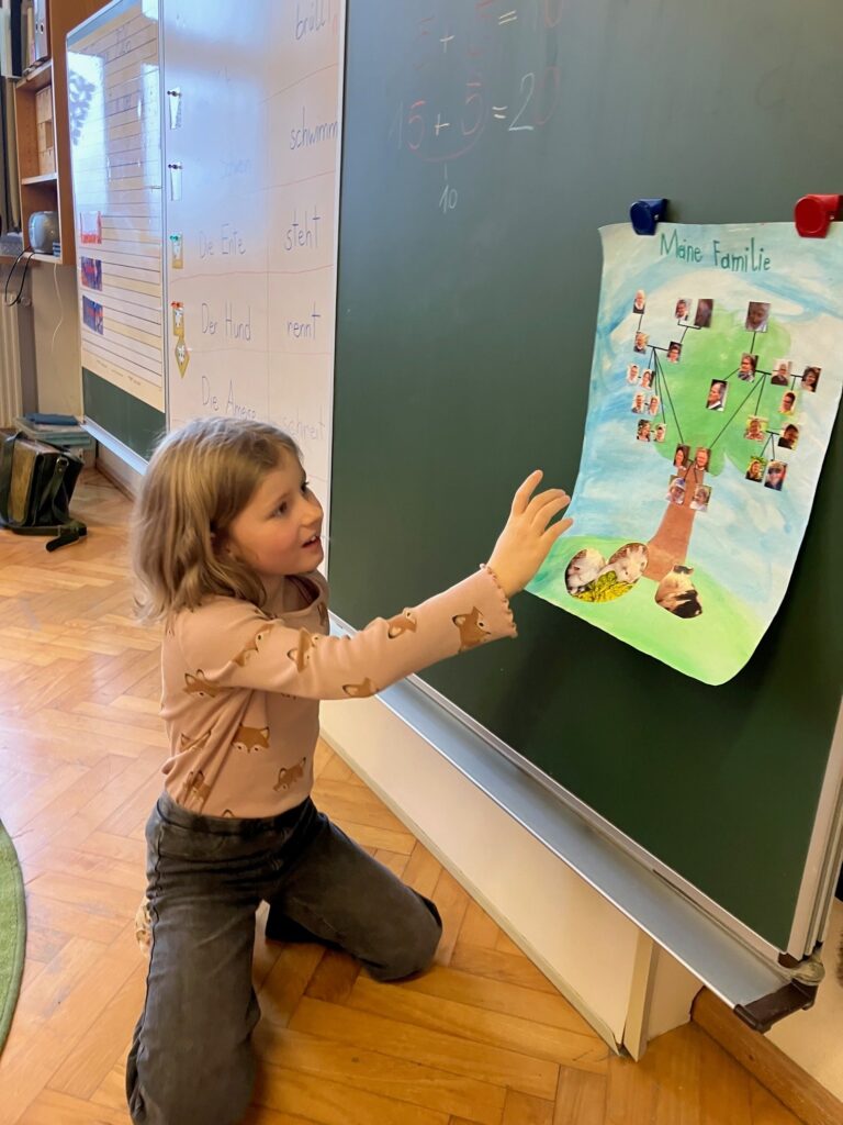 Voller Stolz präsentierten die Kinder der 1b nach den Semesterferien ihre Familien auf den selbstgestalteten Stammbäumen.